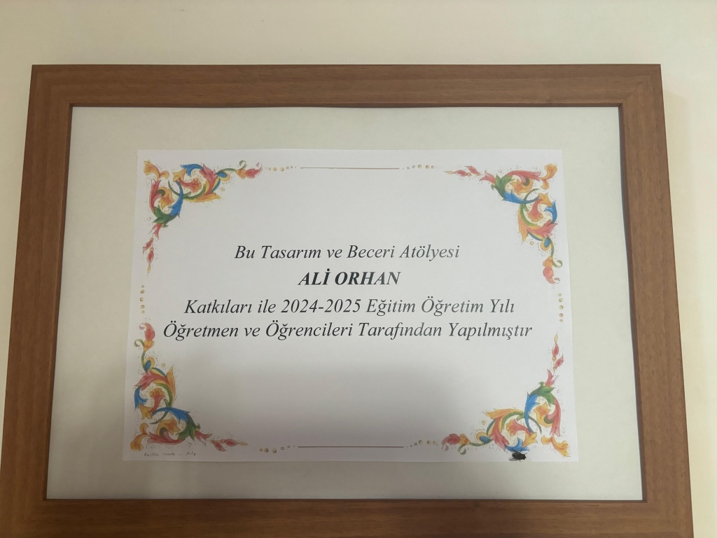 Bu vesileyle, eğitime verdiği destekten dolayı hayırseverimiz Ali Orhan’a teşekkür ediyor, öğrencilerimiz için böylesine önemli bir alanı okulumuza kazandırmanın gururunu yaşıyoruz. Ayrıca, atölyemizin öğrencilerimizin ufkunu genişletecek projelerle daha da değer kazanmasında emeği bulunan Resim Öğretmenimiz Eşref SOMER’e de şükranlarımızı sunuyoruz.